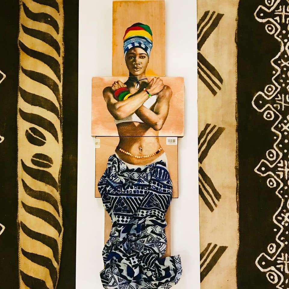 Collaboration between artists Anthony Burks Sr. & Trina Slade-Burks. Mixed media (Recycled cigar box, colored pencil, African fabric, wooden beads, beads)